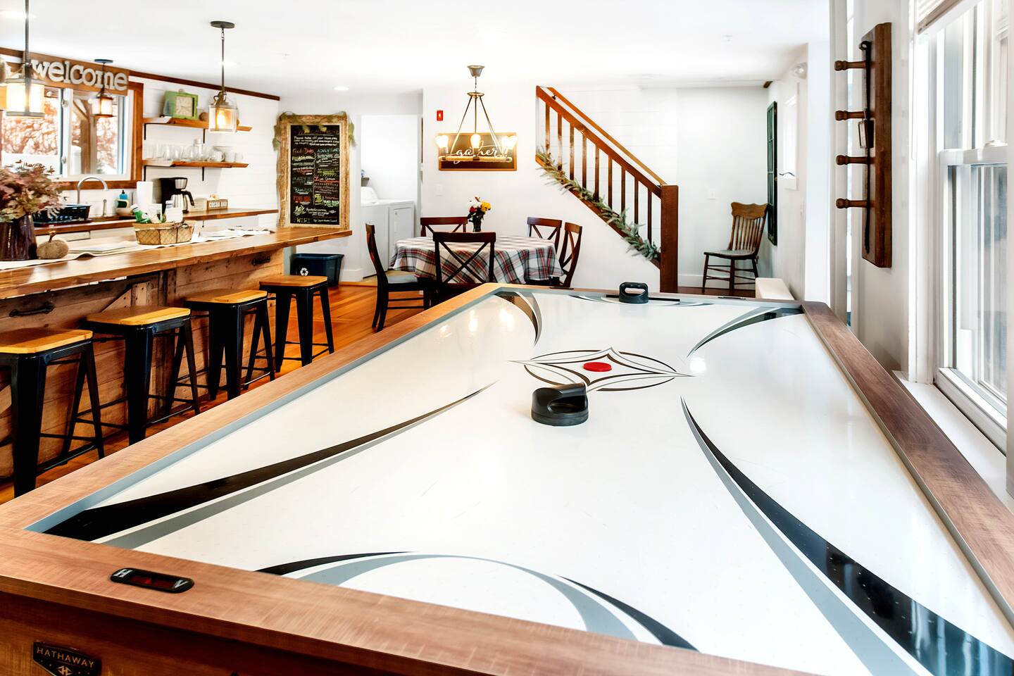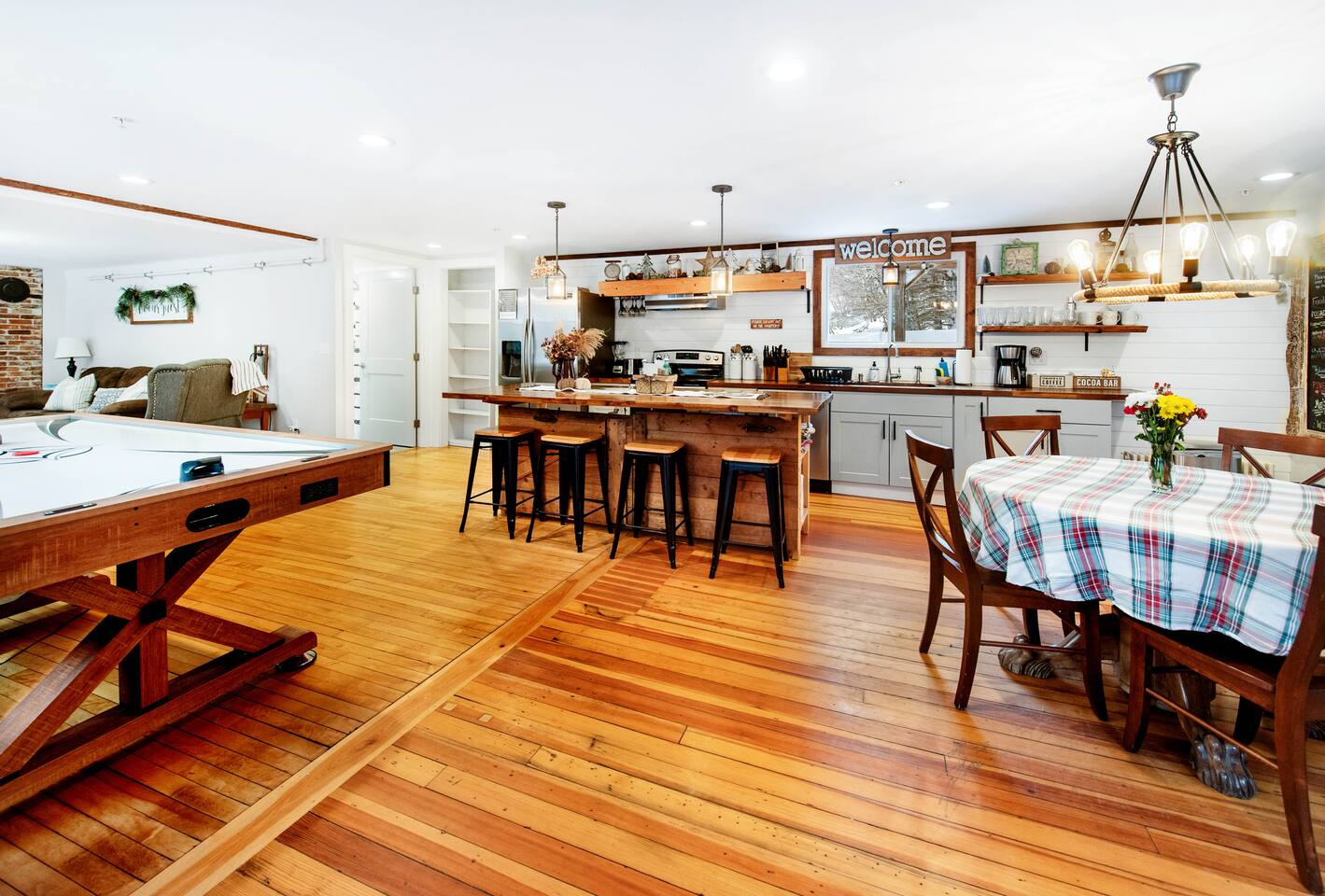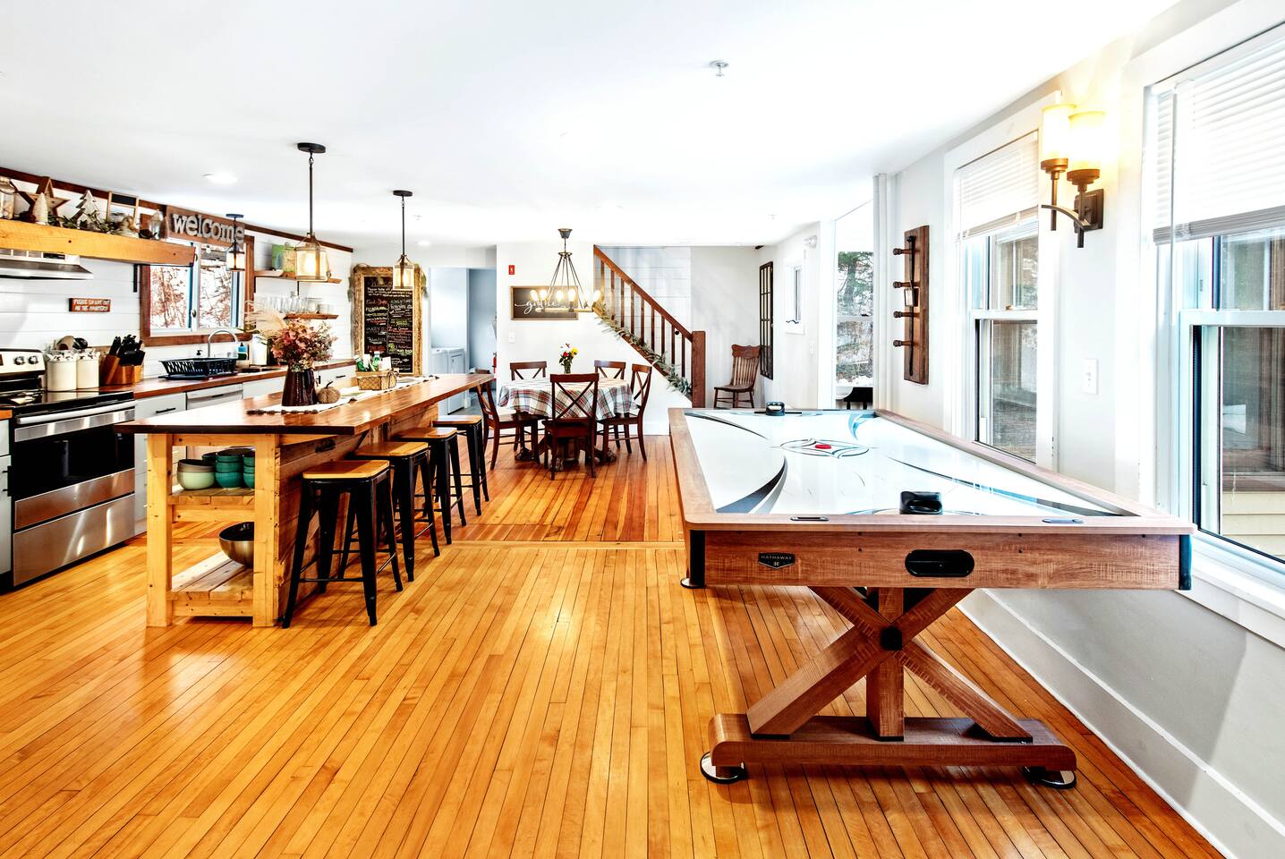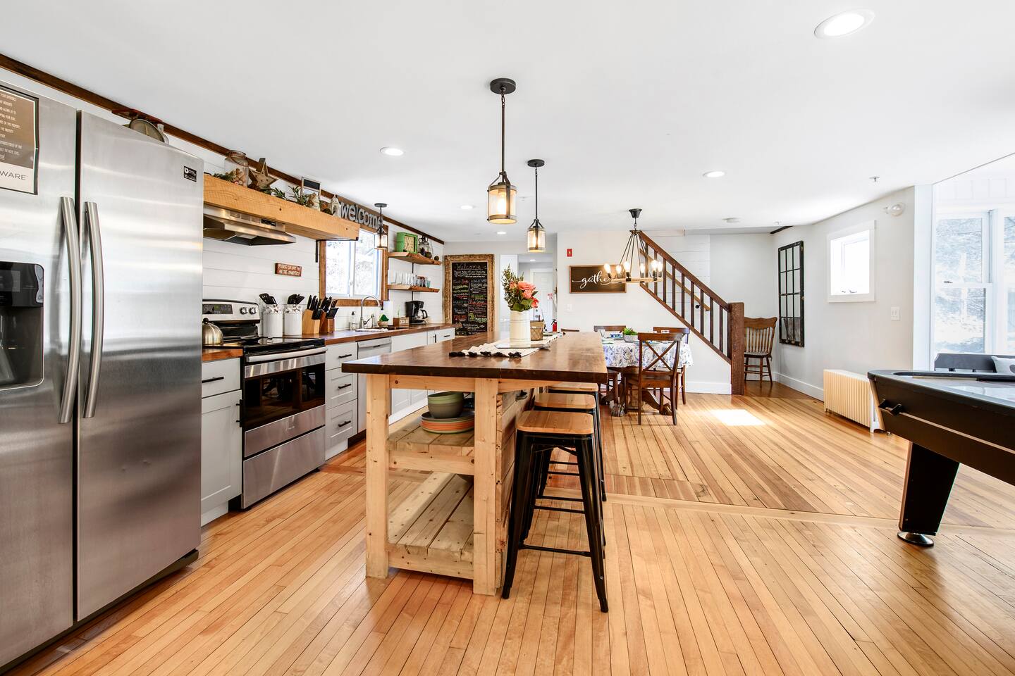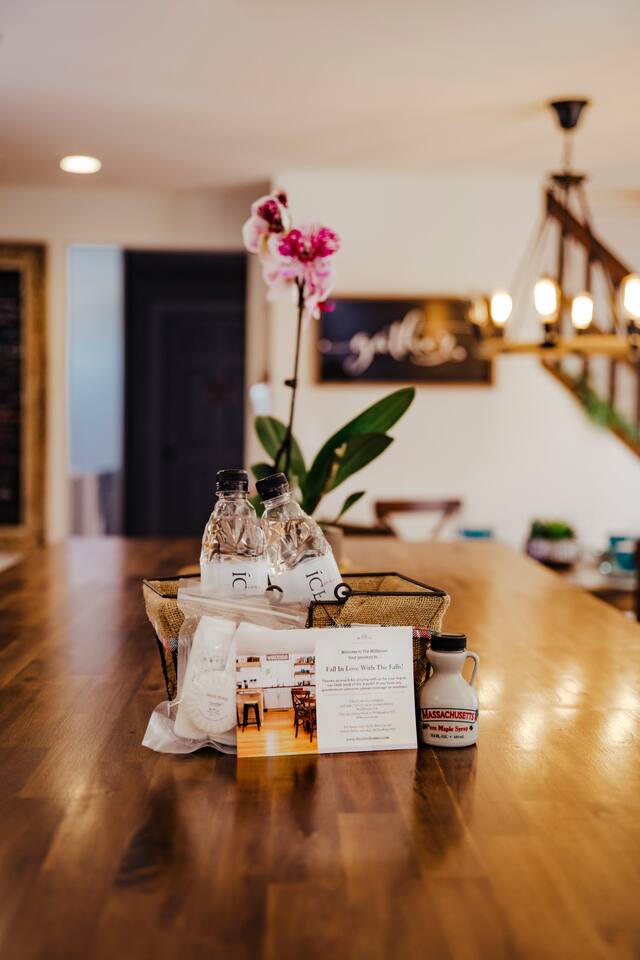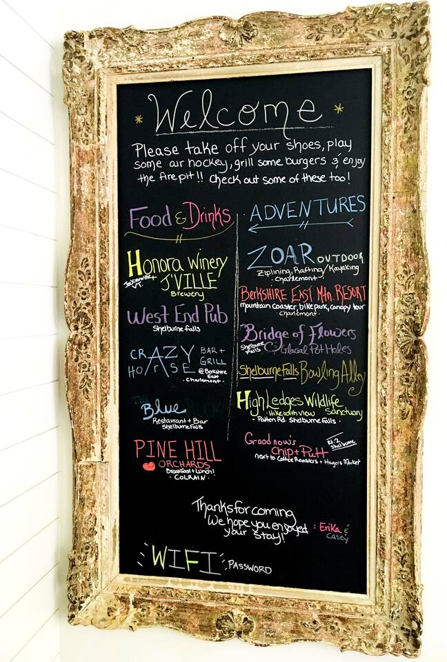 Enter into the brightly lit kitchen/dining with seating for 10 while the kids enjoy the air hockey table and board games close by. You'll adore cooking in our stunning kitchen which guests absolutely love! The first floor bedroom is tucked away from the fun activities, while 4 bedrooms upstairs offer plenty of space and privacy. 5 minutes from Shelburne Falls and local areas for downhill and x-country skiing, hiking, restaurants, shops and more. Don't miss out!