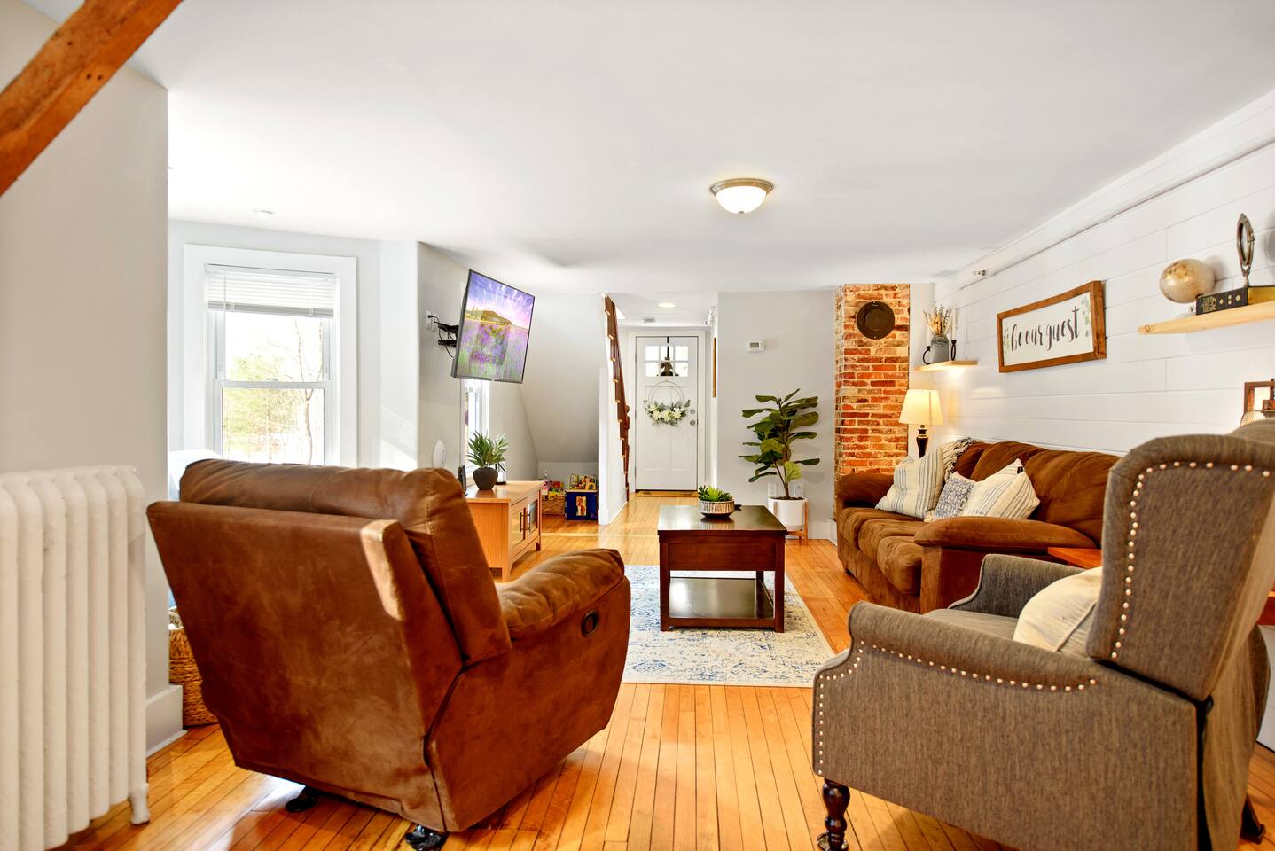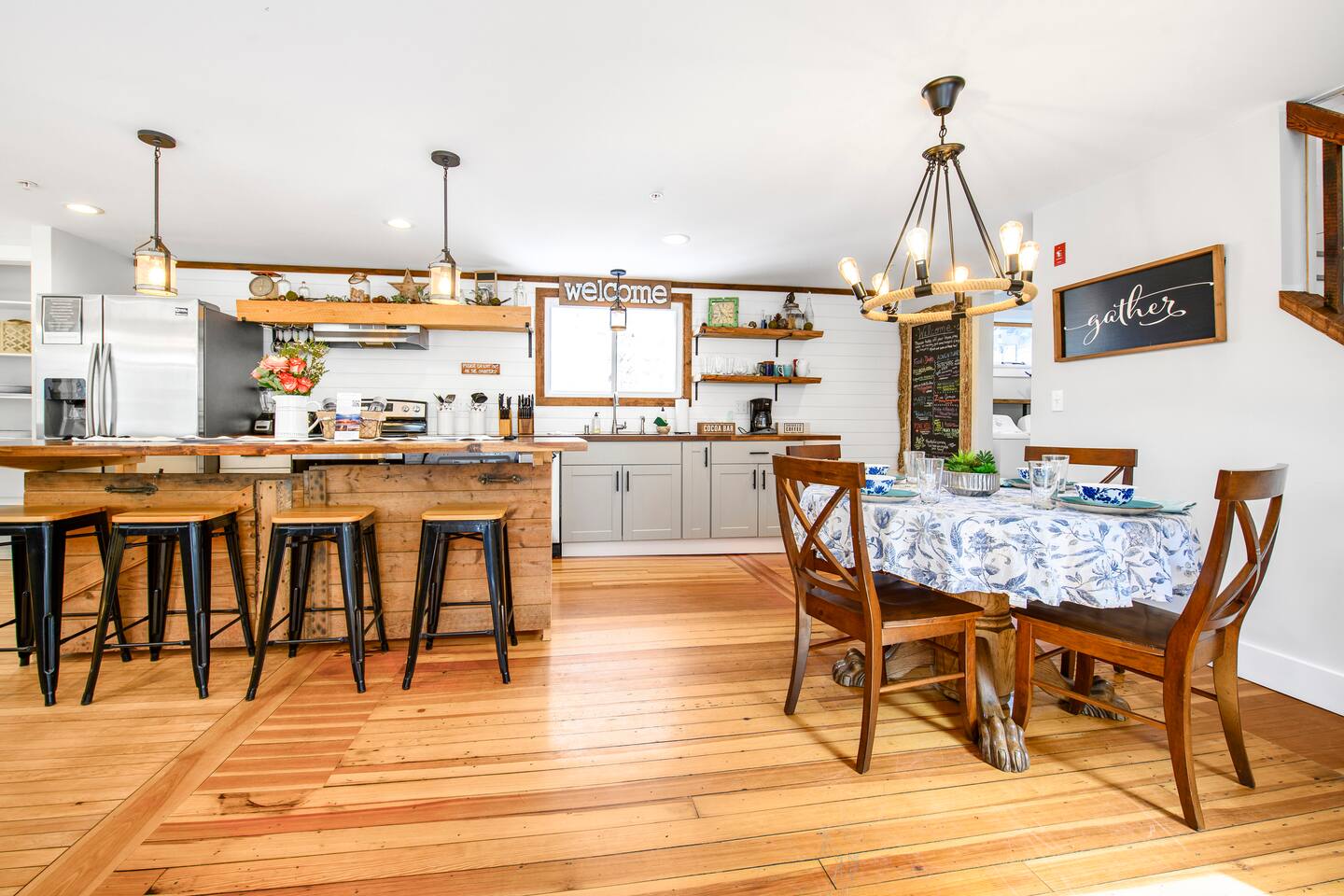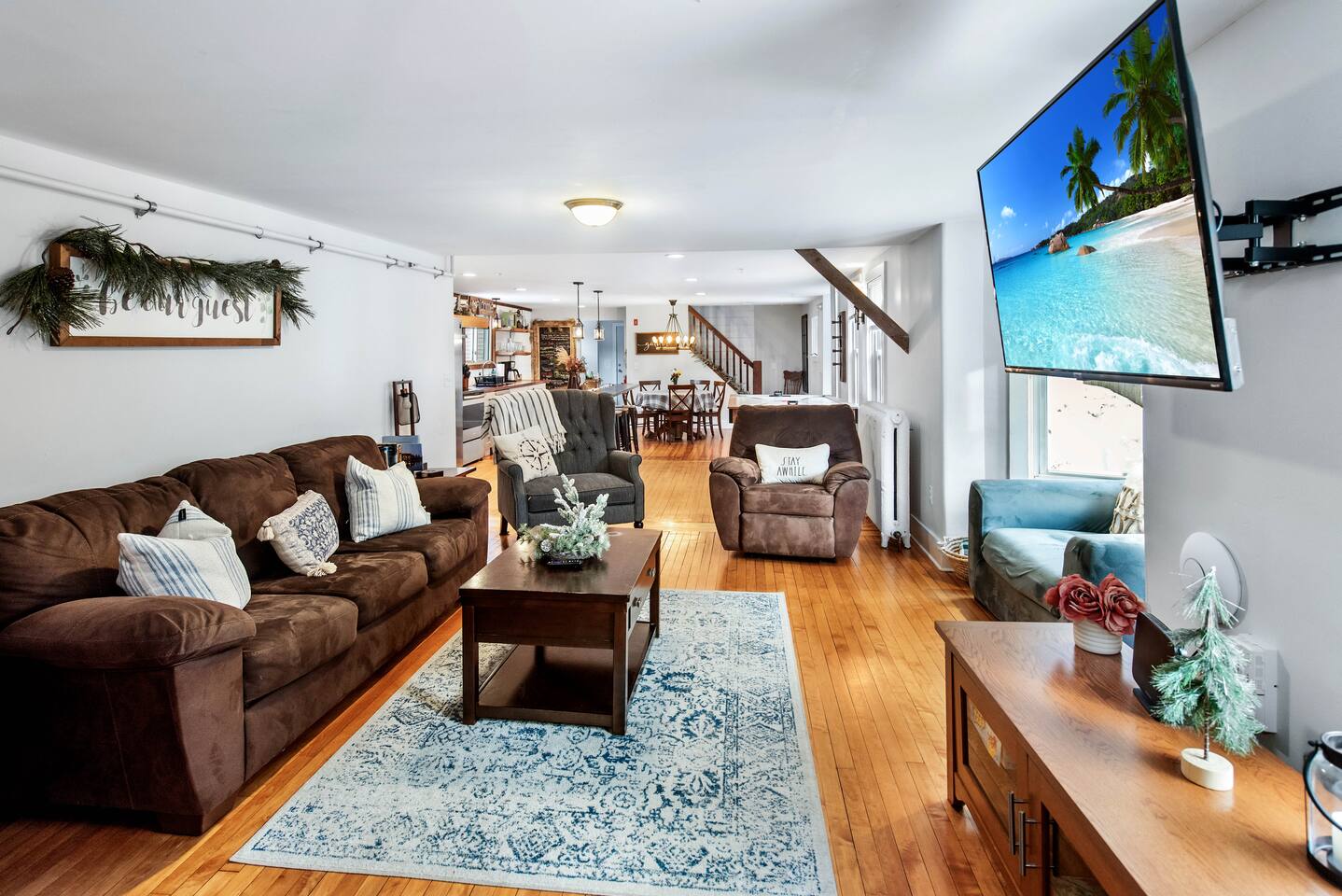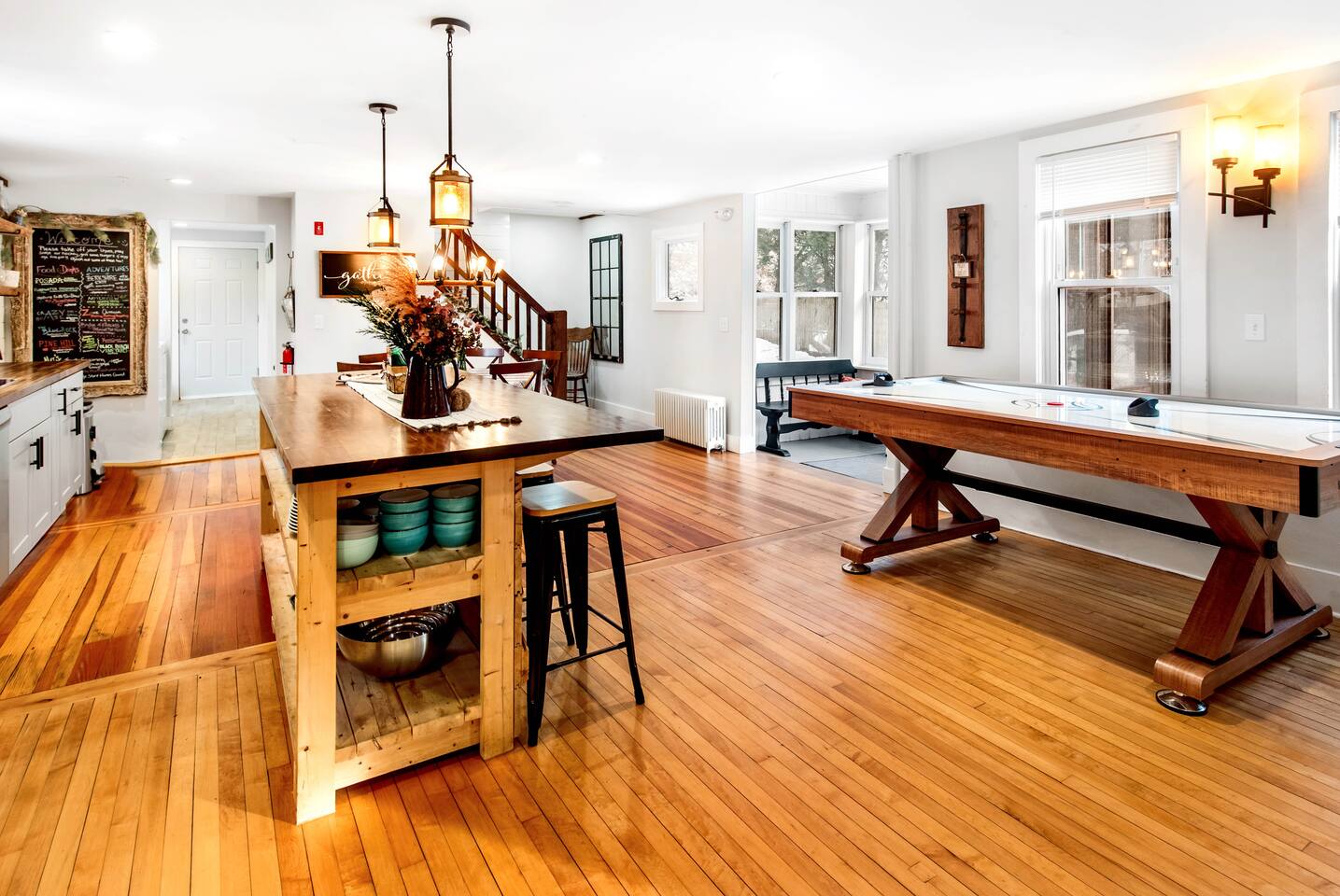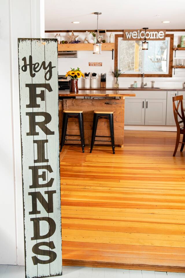 Enter into the brightly lit kitchen/dining with seating for 10 while the kids enjoy the air hockey table and board games close by. You'll adore cooking in our stunning kitchen which guests absolutely love! The first floor bedroom is tucked away from the fun activities, while 4 bedrooms upstairs offer plenty of space and privacy. 5 minutes from Shelburne Falls and local areas for downhill and x-country skiing, hiking, restaurants, shops and more. Don't miss out!