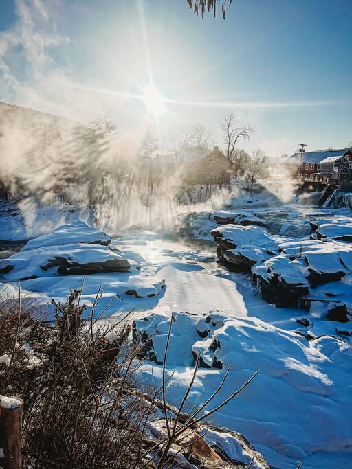 1 bedroom is on the upper level with the only bathroom on the main level. We do not allow parties or events. This is a Pet Free home. We have a plow service to take care of the driveway, sand and shovel the steps. He will arrive after the storm has passed. If you notice that the entry steps look slippery or hazardous, there is a snow shovel and bucket of salt in the entry for your convenience. You may be messaged after a storm to assist the plow driver by moving your vehicles so he can make the driveway safe for the remainder of your stay. There is limited cell service in this area. AT&T customers have better service, but none for Verizon. The home is located across the street from an industrial cotton mill and nearby treatment facility. This home is equipped with 2 NoiseAware devices. One inside and one outside. This device does not record audio, but monitors decibel levels. When noise reaches a preset threshold for a sustained time you will receive a message to respectfully reduce the noise to a reasonable level. These devices help us keep noise down for the benefit of the neighborhood.
